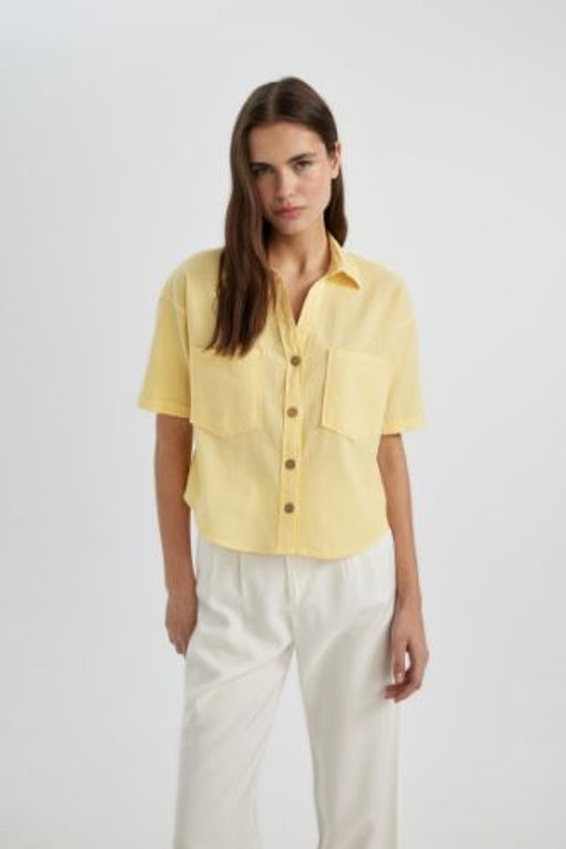 Oversize Genis Kal?p Gomlek Yaka Keten Kar?s?ml? K?sa Kollu Bluz