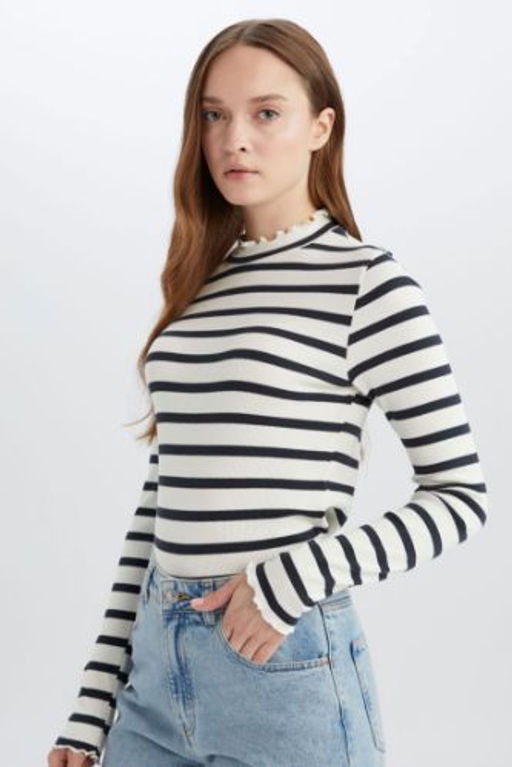 Yar?m Bal?kc? Yaka Cizgili Uzun Kollu Tisort
