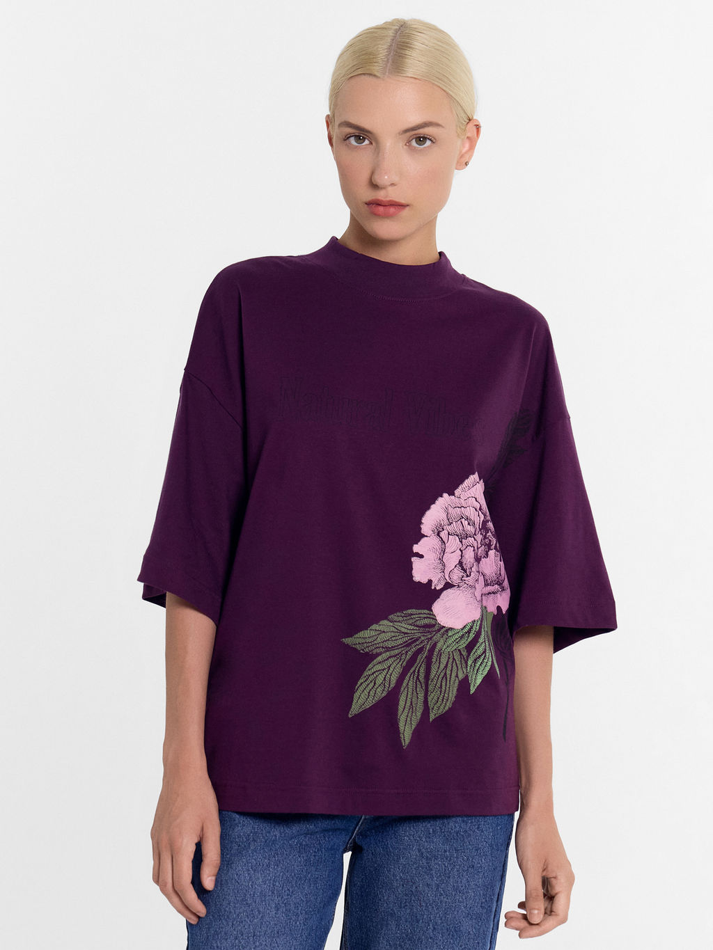 Футболка женская фиолетовая с цветком инжир +печать 112874