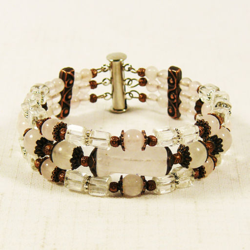 Браслет из розового кварца и горного хрусталя на пружине тройной 17 см