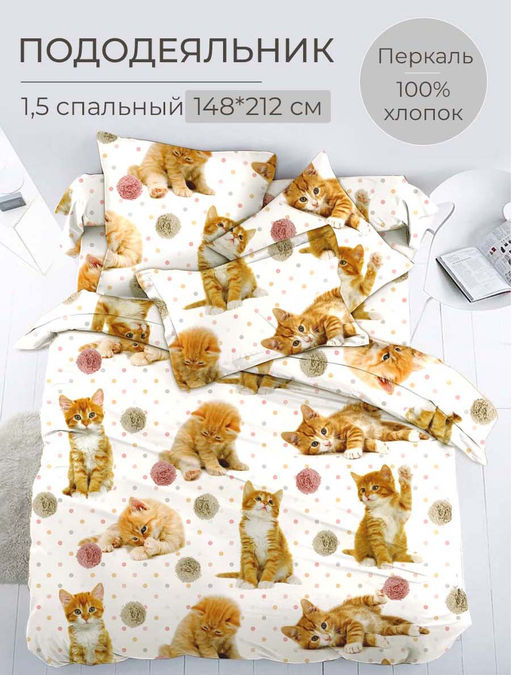 Артикул: Пододеяльник 1,5-спальный, перкаль, детская расцветка (Рыжие котята)