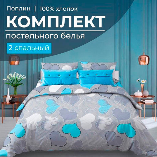 Комплект постельного белья 2-спальный, поплин (Романтика, голубой)