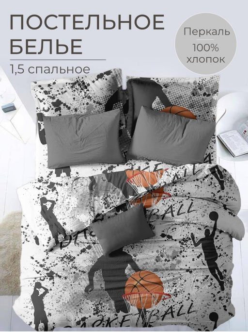 Артикул: Комплект постельного белья 1,5-спальный, перкаль, детская расцветка (Баскетбол)