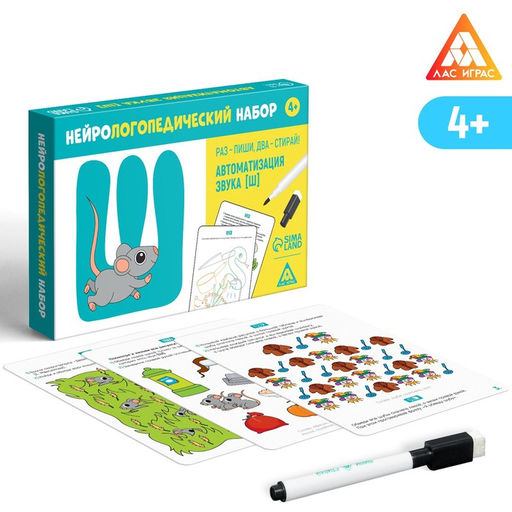 Нейрологопедический набор Раз - пиши, два - стирай. Автоматизация звука Ш, 15 карточек, 2 маркера, 4+