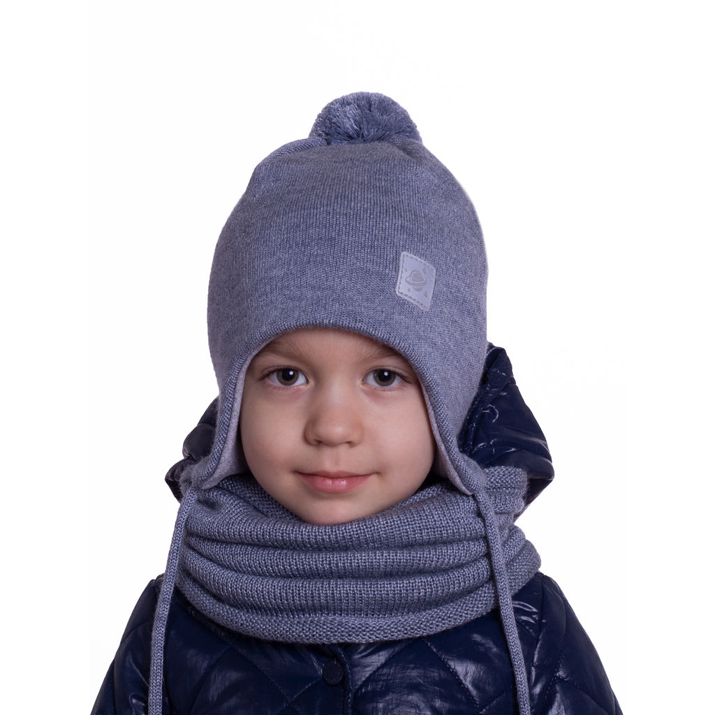 Шапка вязаная двухслойная с ниточным помпоном с завязками и светоотражающим шевроном "Космос" (полуш
