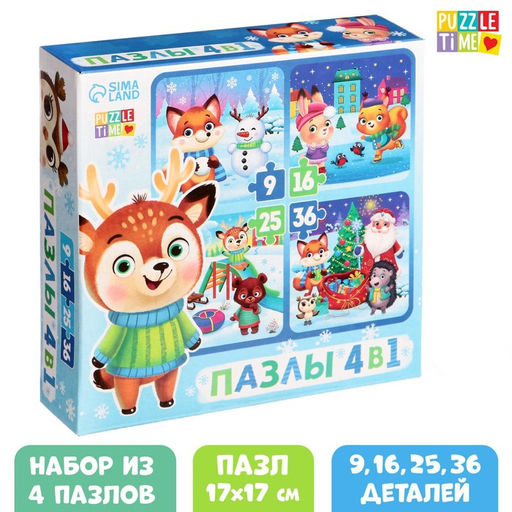 Пазлы 4 в 1 Весело встретим Новый год, 9, 16, 25, 36 элементов