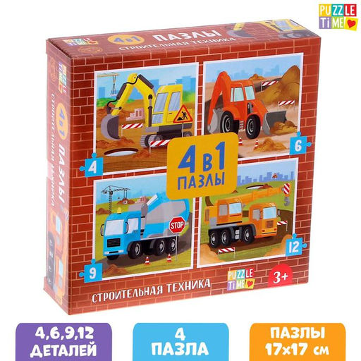 Пазлы 4 в 1 Строительная техника, 4, 6, 9, 12 элементов