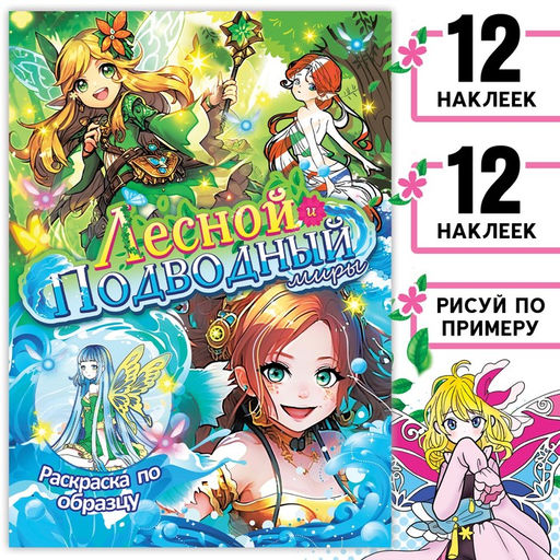Раскраска по образцу с наклейками Лесной и подводный миры, 16 стр., Аниме