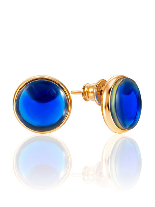 Яркие позолоченные пусеты с янтарём синего цвета Фурор