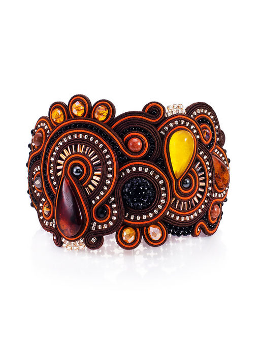 Плетеный браслет с вставками из натурального коньячного янтаря и кристаллов Индия