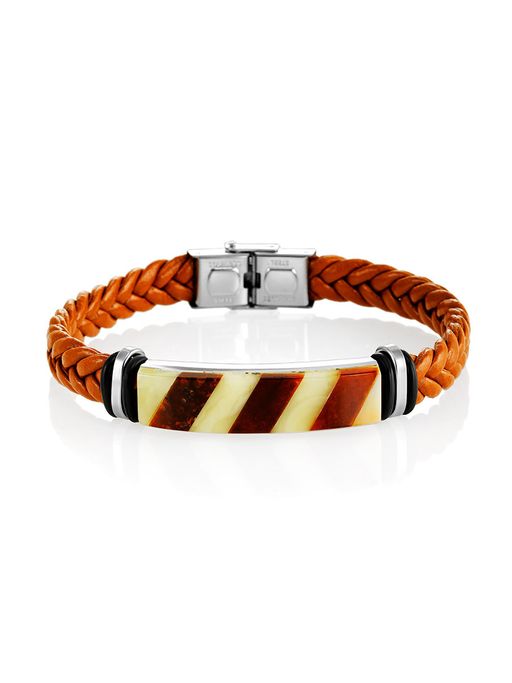 Яркий плетёный браслет из светло-коричневой кожи, украшенный янтарной мозаикой Сильверстоун