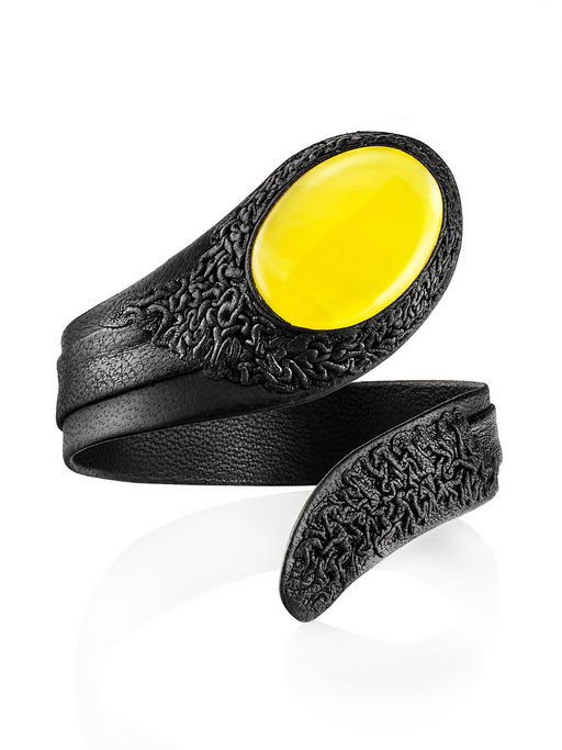 Браслет из натуральной кожи Змейка, украшенный ярко-медовым янтарём