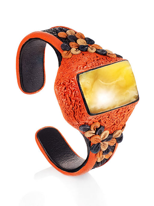Эффектный браслет-манжета из натуральной кожи с пейзажным янтарём Нефертити