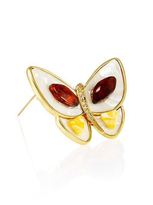 Изящная брошь Бабочка с крыльями, украшенными перламутром и янтарём