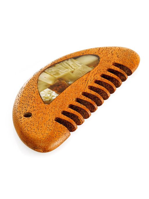 Гребень для волос из дерева, украшенный натуральным янтарём