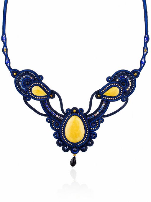 Яркое плетёное колье, украшенное живописным пейзажным янтарём Индия