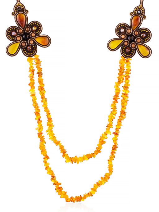 Ажурное плетеное колье с вставками из натурального янтаря и с ниткой лечебных бус Индия
