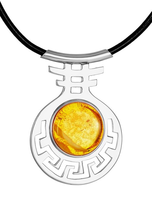 Стильное колье с подвеской из серебра и янтаря на каучуковом шнурке Эллада