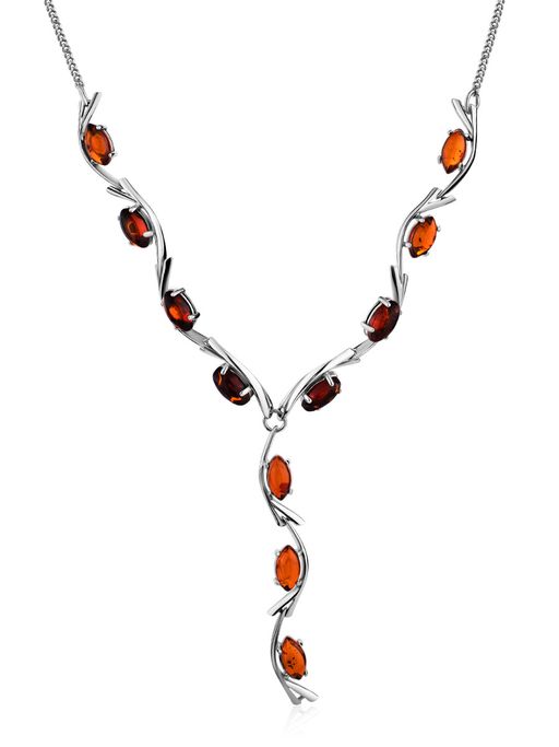 Изящное легкое колье из серебра с натуральным сверкающим янтарем коньячного цвета Ирис