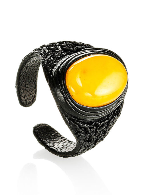 Кольцо-перстень из натуральной кожи с овальной вставкой из медового янтаря Нефертити