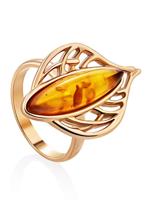 Красивое позолоченное кольцо с натуральным золотистым янтарём Листочек