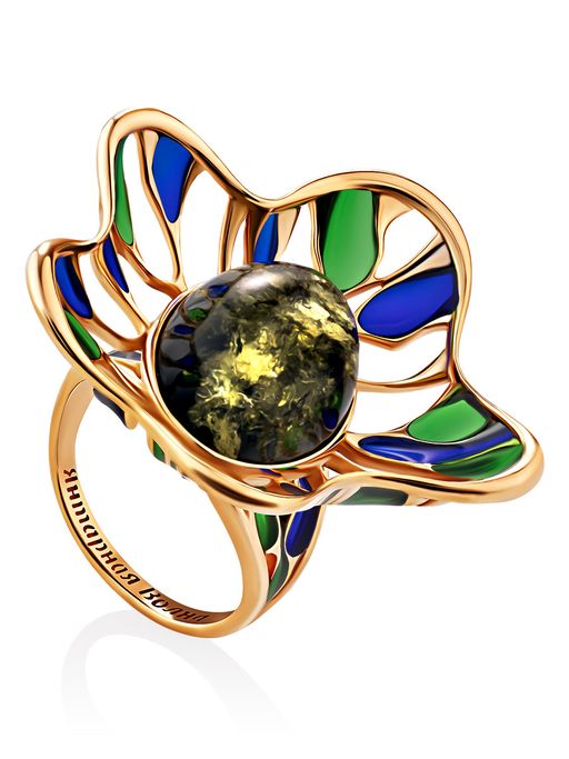 Роскошное кольцо из позолоченного серебра с натуральным янтарём и эмалью Verona