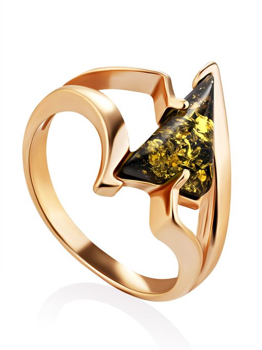 Стильное кольцо Герника из серебра в позолоте с натуральным зелёным янтарём