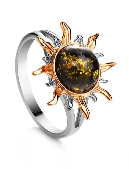 Кольцо из серебра с позолотой и искрящегося зелёного янтаря Гелиос