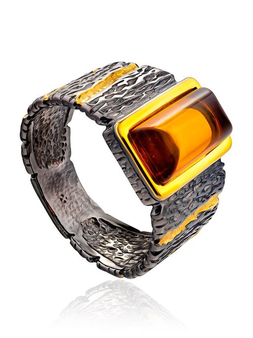 Яркое кольцо из черненого серебра с позолотой и коньячного янтаря Бубинга