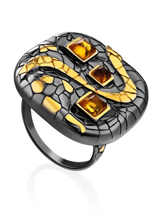 Роскошное кольцо Донателла из чернёного серебра с золочением, украшенное янтарём