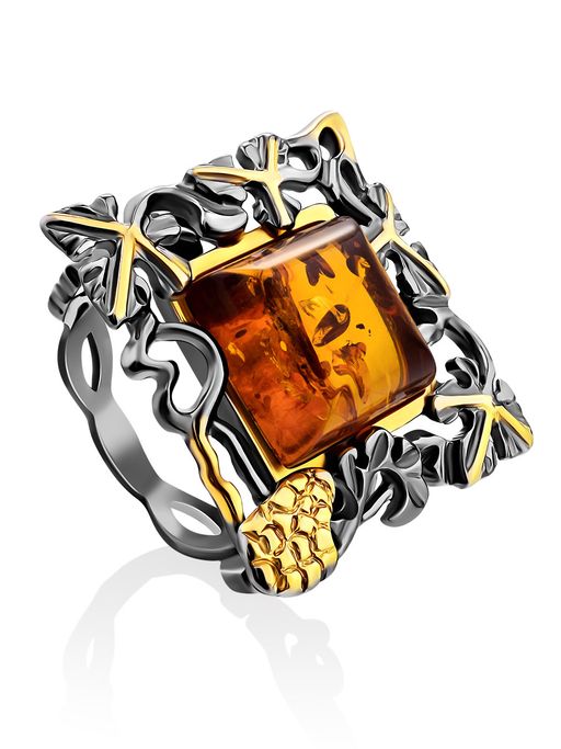 Роскошное ажурное кольцо из серебра с чернением и золочением и янтаря Лиора