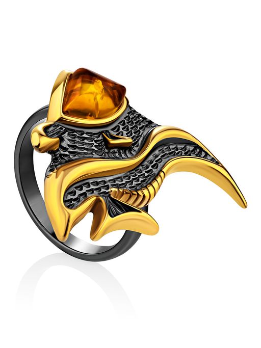 Оригинальное кольцо Рыбка из чернёного серебра с золочением и янтаря