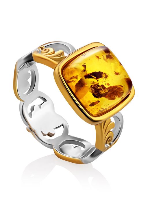 Красивое эффектное кольцо Валетта из серебра с позолотой и натурального янтаря