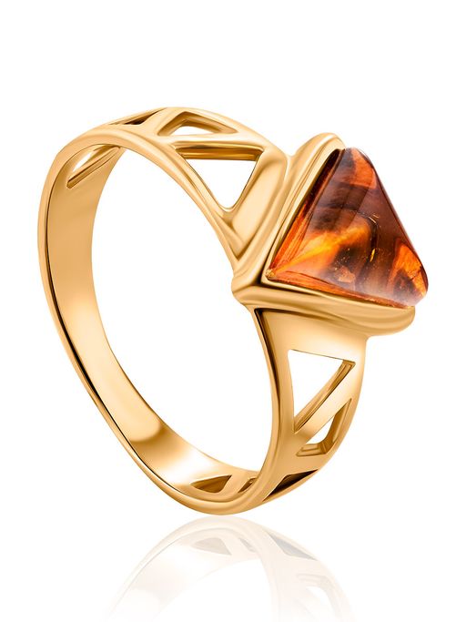Кольцо в геометрическом дизайне Триада из позолоченного серебра и коньячного янтаря