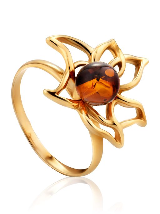 Изящное кольцо из позолоченного серебра с янтарём Лотос