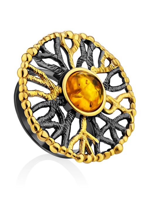 Ажурное кольцо из черненого серебра с позолотой и натурального янтаря Алхимия