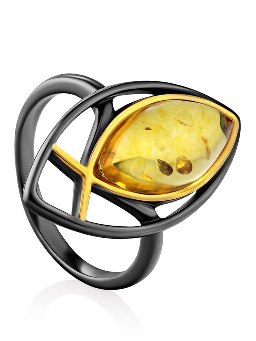 Ажурное кольцо из чернёного серебра с золочением и янтаря Рыбка