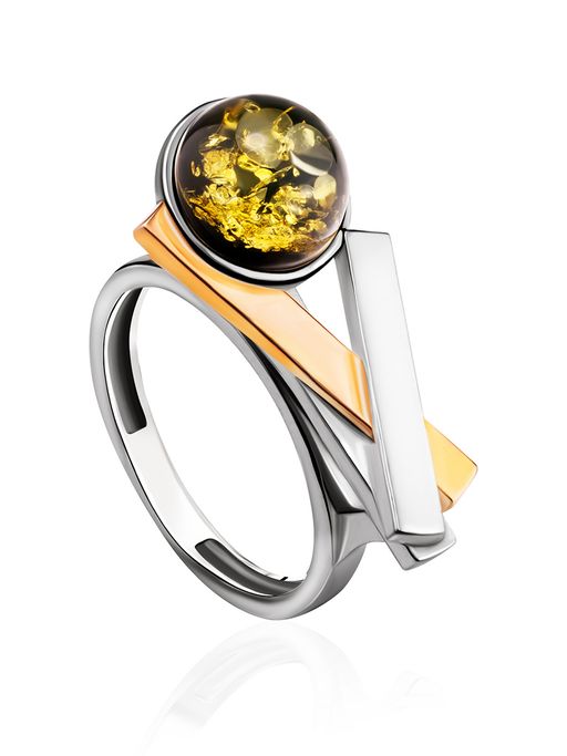 Оригинальное кольцо из серебра с позолотой и зелёного янтаря Люмьер