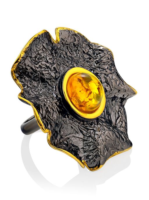 Роскошное объёмное кольцо из чернёного серебра с золочением и янтаря Мак