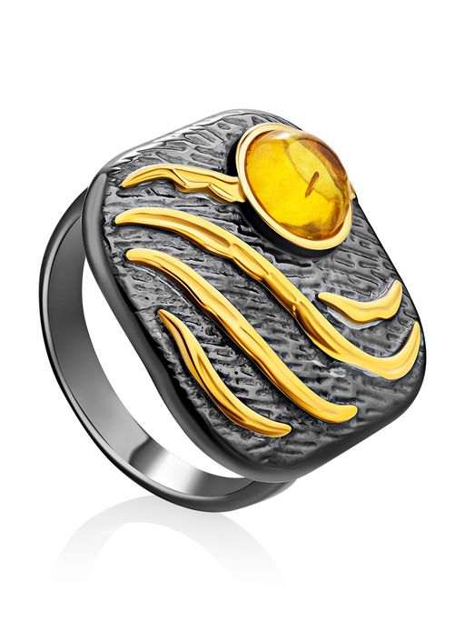 Эффектное квадратное кольцо из серебра с золочением, украшенное янтарём Эритрея
