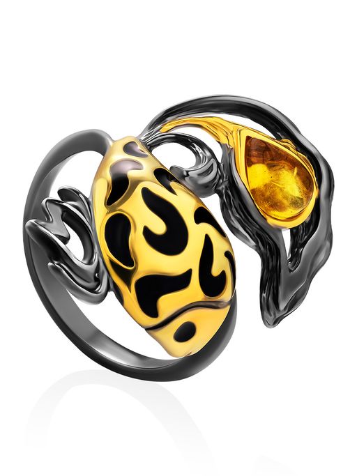 Яркое кольцо из черненого серебра с золочением и натурального янтаря Рыбка