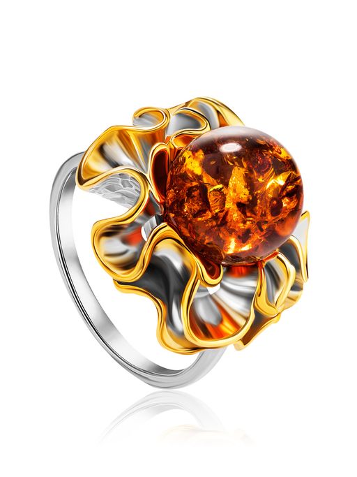 Яркое объёмное кольцо из серебра с позолотой и коньячного янтаря Маргаритка