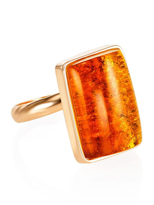 Яркое прямоугольное кольцо из позолоченного серебра и коньячного янтаря
