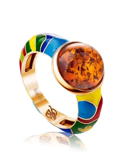 Яркое кольцо из позолоченного серебра с эмалью и натурального янтаря Суздаль