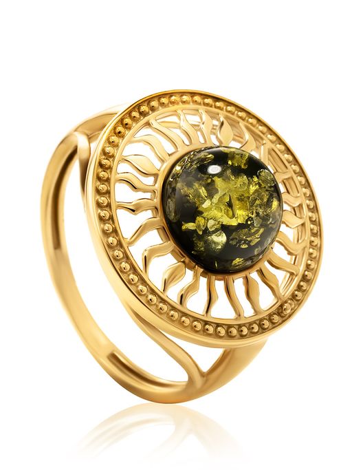 Эффектное позолоченное кольцо с зелёным янтарём Парнас