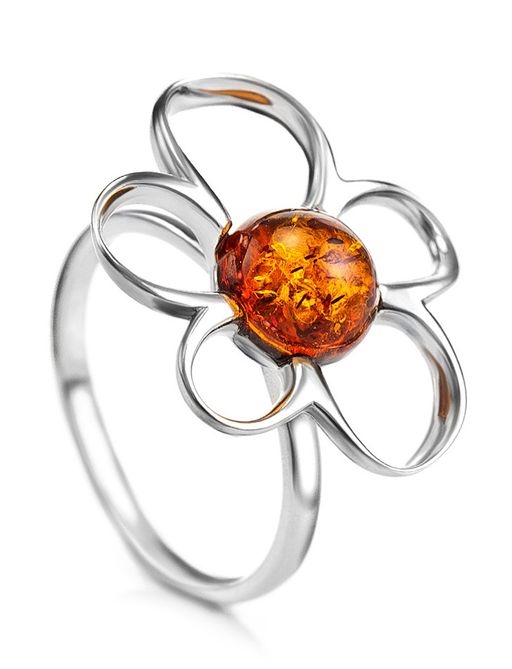 Кольцо из серебра 925 пробы с натуральным янтарём коньячного цвета Ромашка
