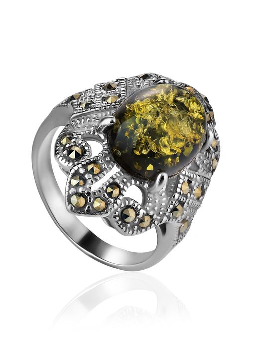 Эффектное серебряное кольцо с янтарем и марказитами Эйфория