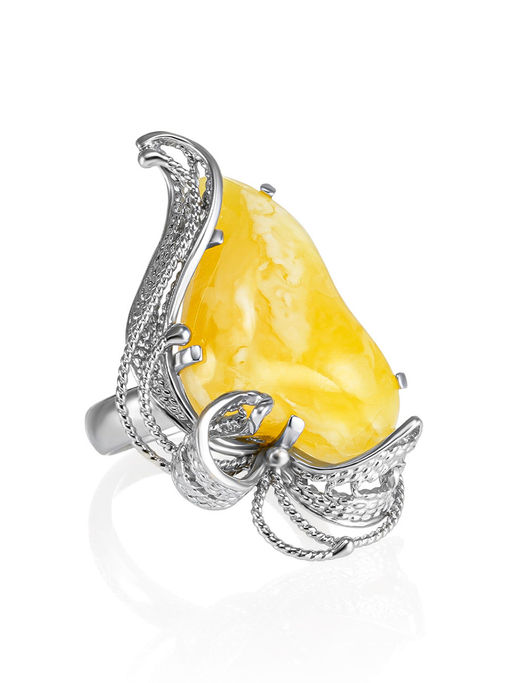 Крупное кольцо с натуральным пейзажно-медовым живописным янтарем Филигрань
