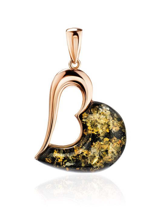 Кулон в виде сердца из позолоченного серебра и янтаря зелёного цвета Санрайз