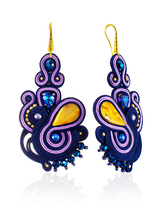 Необычные плетёные серьги с янтарём и кристаллами Индия